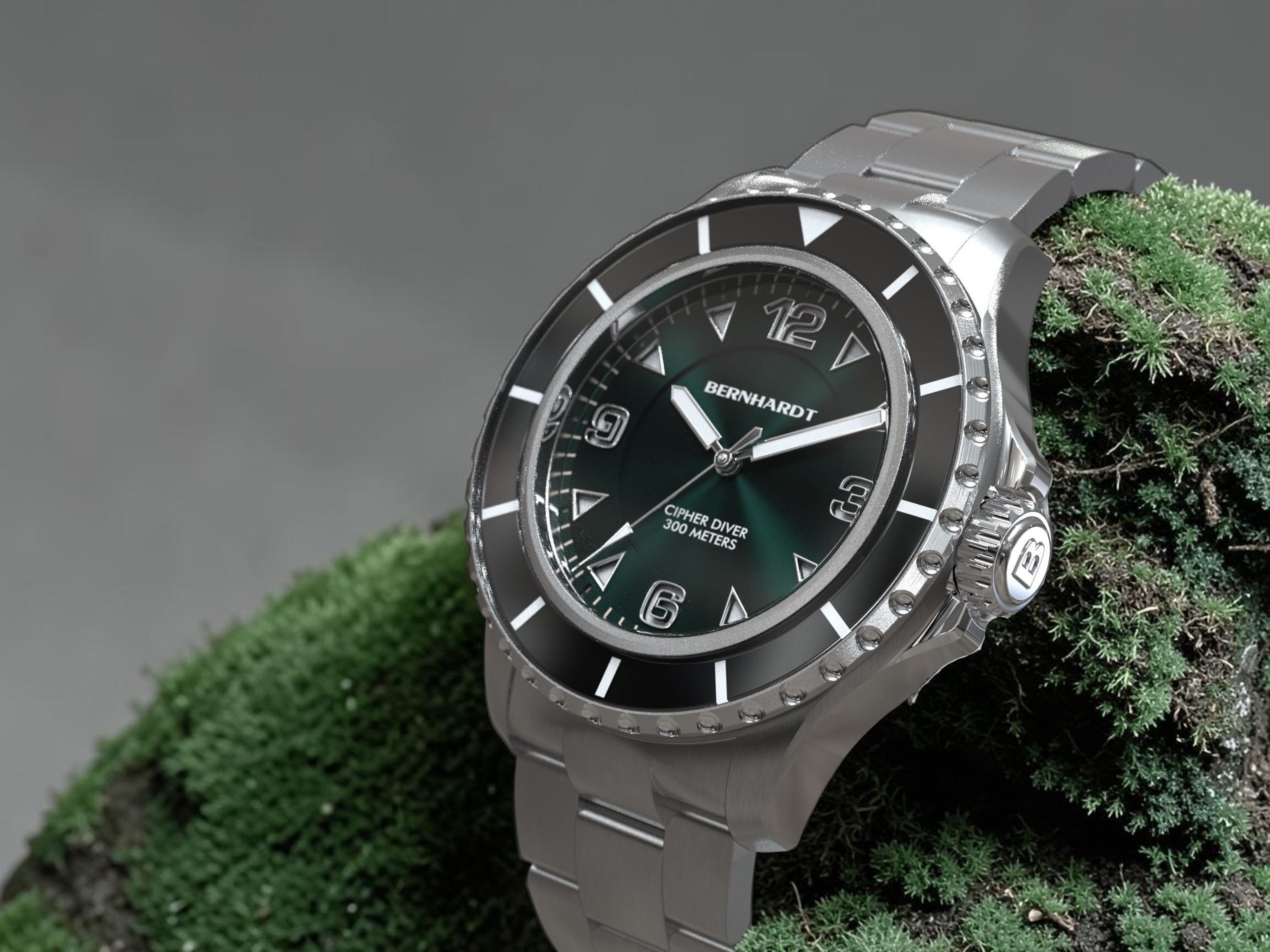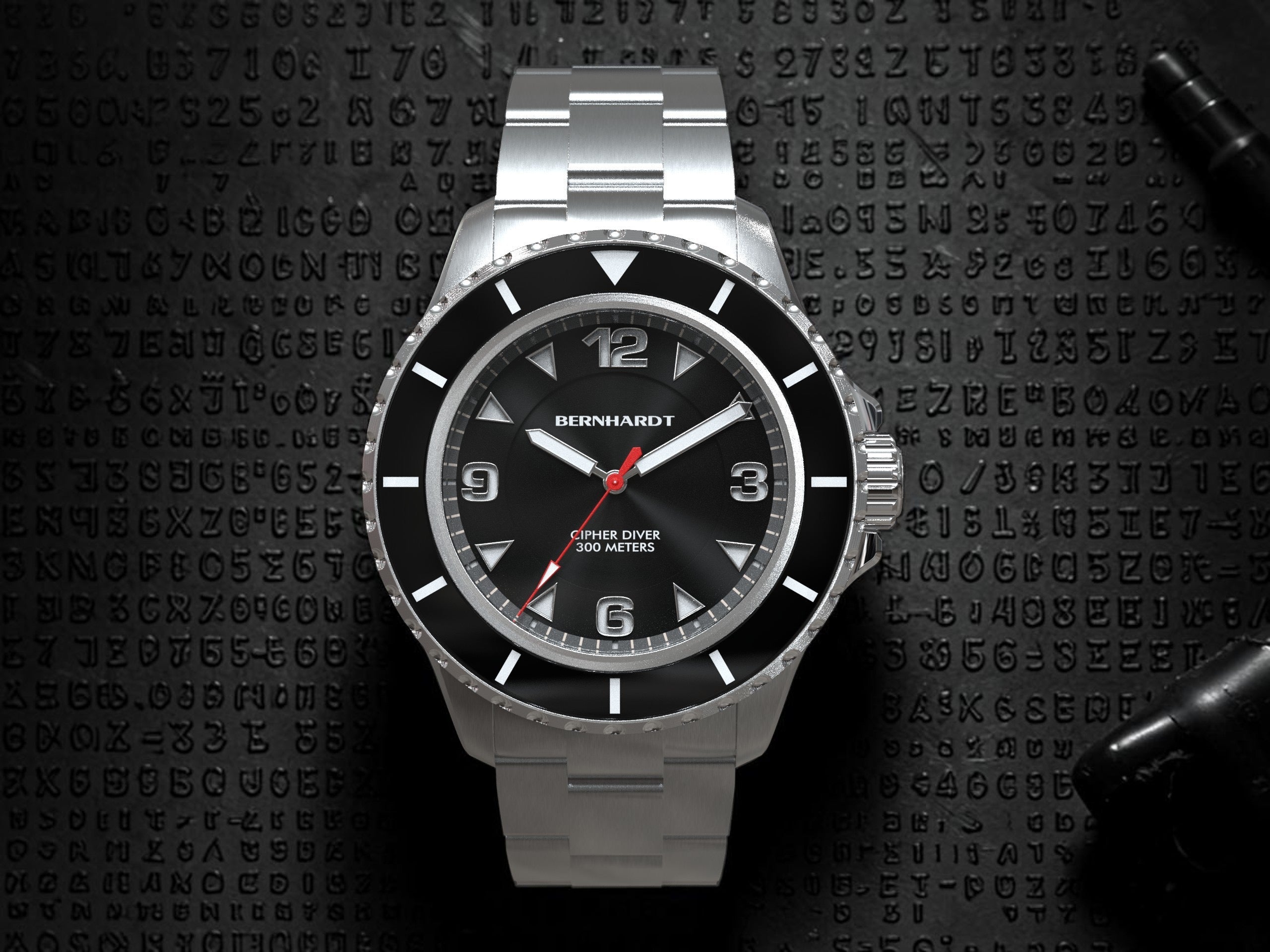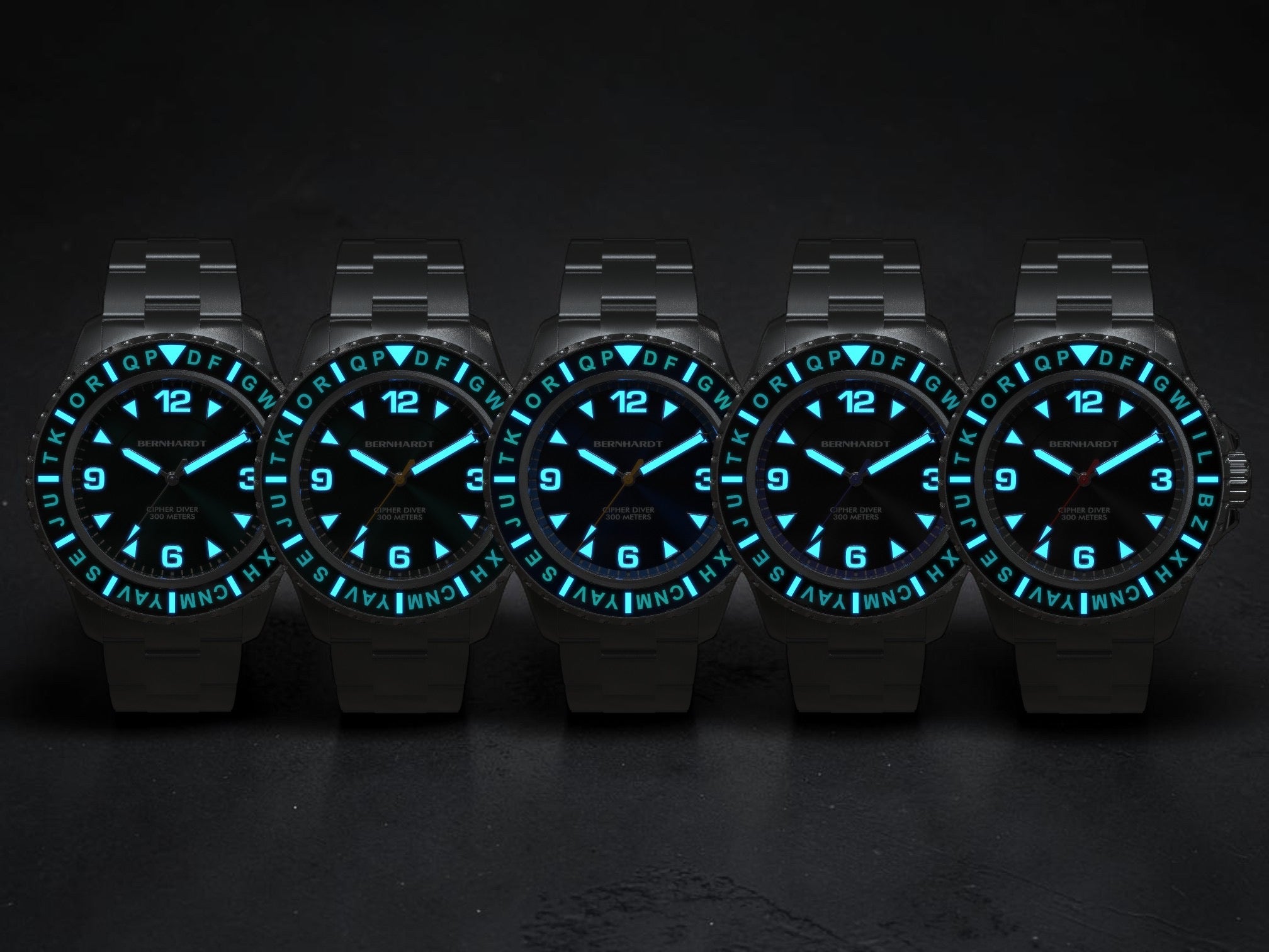 The Cipher Diver features high-grade BGW9 Super-LumiNova on the hands, indices, and bezel pip for excellent low-light legibility. Hidden beneath the sapphire bezel are UV-reactive cipher markings, invisible during normal wear and revealed only when intentionally illuminated with UV light.