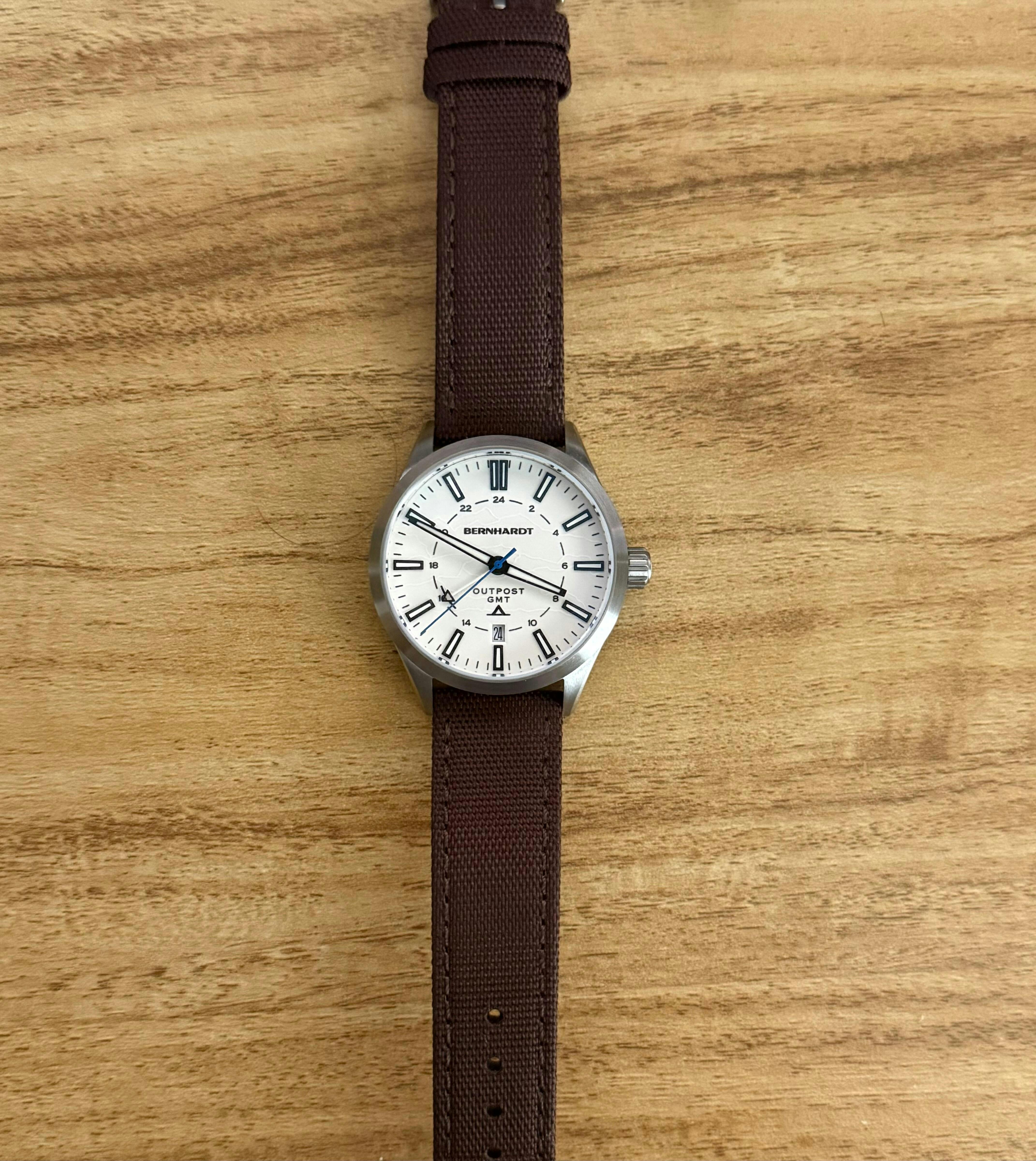 At the heart of the Outpost GMT is the Miyota 9075 GMT movement with an independently jumping local hour hand — the preferred configuration for travel. Set home time once, then jump the local hour hand forward or back as needed while the GMT hand stays anchored.